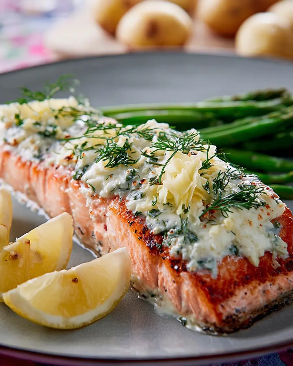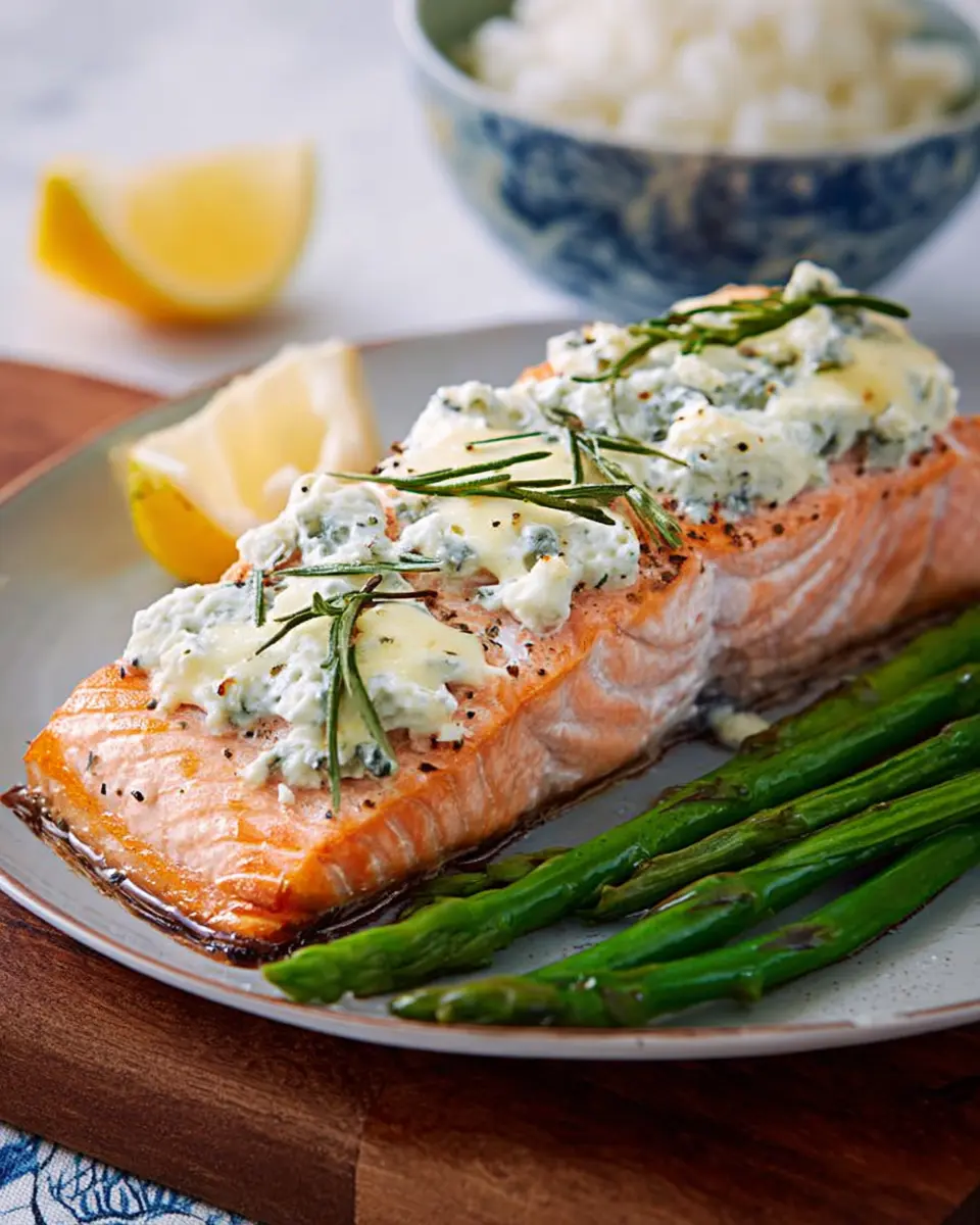 Serve your baked salmon with Boursin topping alongside blanched asparagus for a dish that’s as visually appealing as it is delicious. Enjoy every bite!