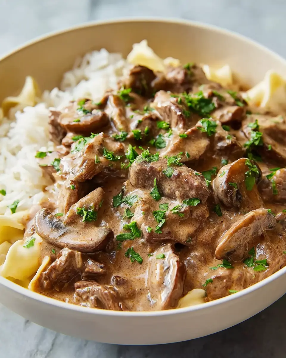 To make your beef stroganoff visually appealing, consider using a shallow bowl. Layer the noodles or rice at the bottom and artfully spoon the savory beef and mushroom sauce on top. Garnish with a sprinkle of freshly chopped parsley for a pop of color and freshness. You could also serve it in individual ramekins for a more personalized touch at dinner parties.