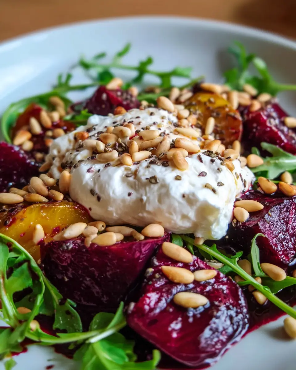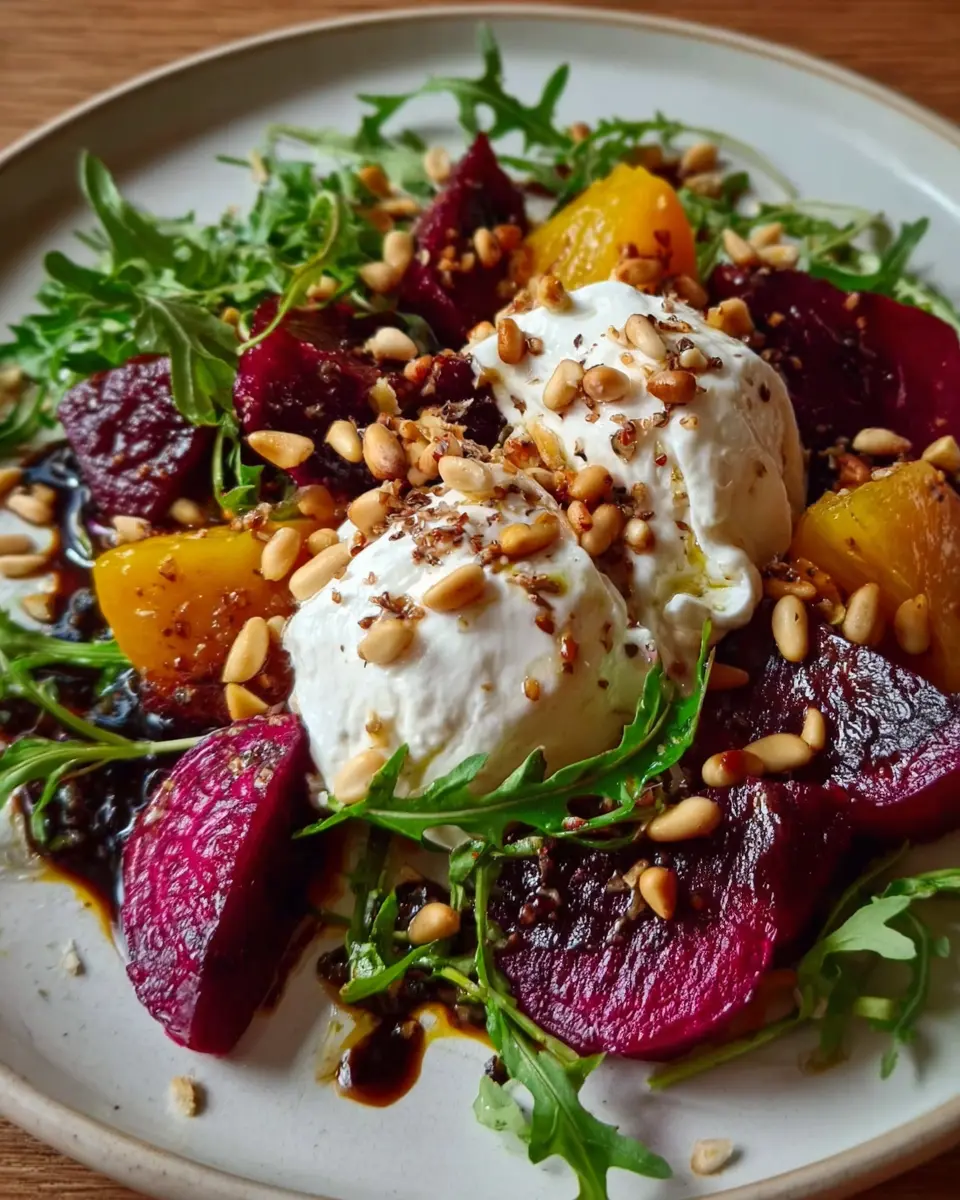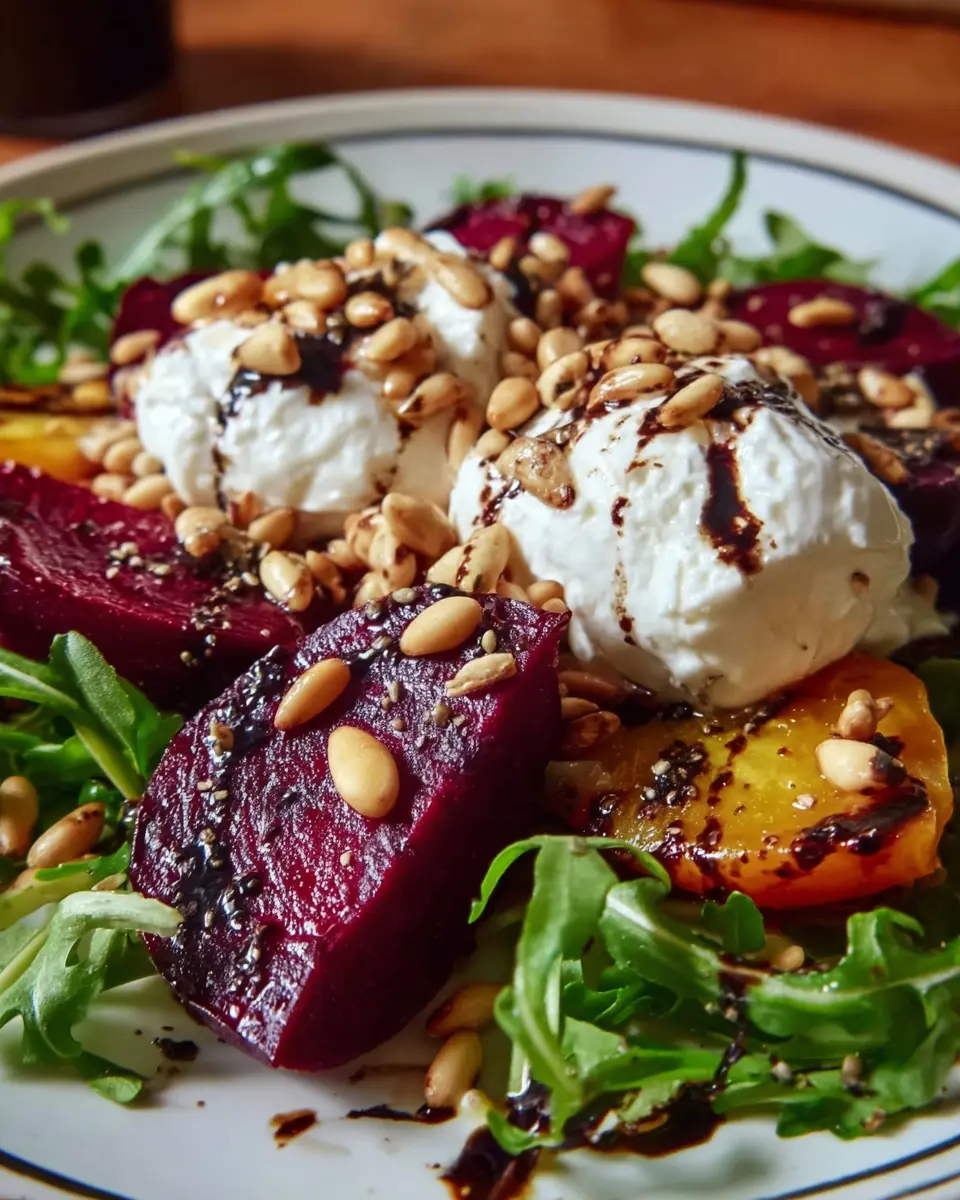 Now for the fun part! Take a large platter and start by laying down a bed of arugula or mixed greens. Arrange the sliced roasted beets artistically atop the greens, allowing their vivid colors to shine. Next, add generous spoonfuls of creamy, dreamy burrata cheese. Scatter the toasted pine nuts over the top, and then drizzle with your homemade dressing, ensuring every bite gets that delicious flavor. Don't hesitate to season with a little extra salt and pepper to taste!