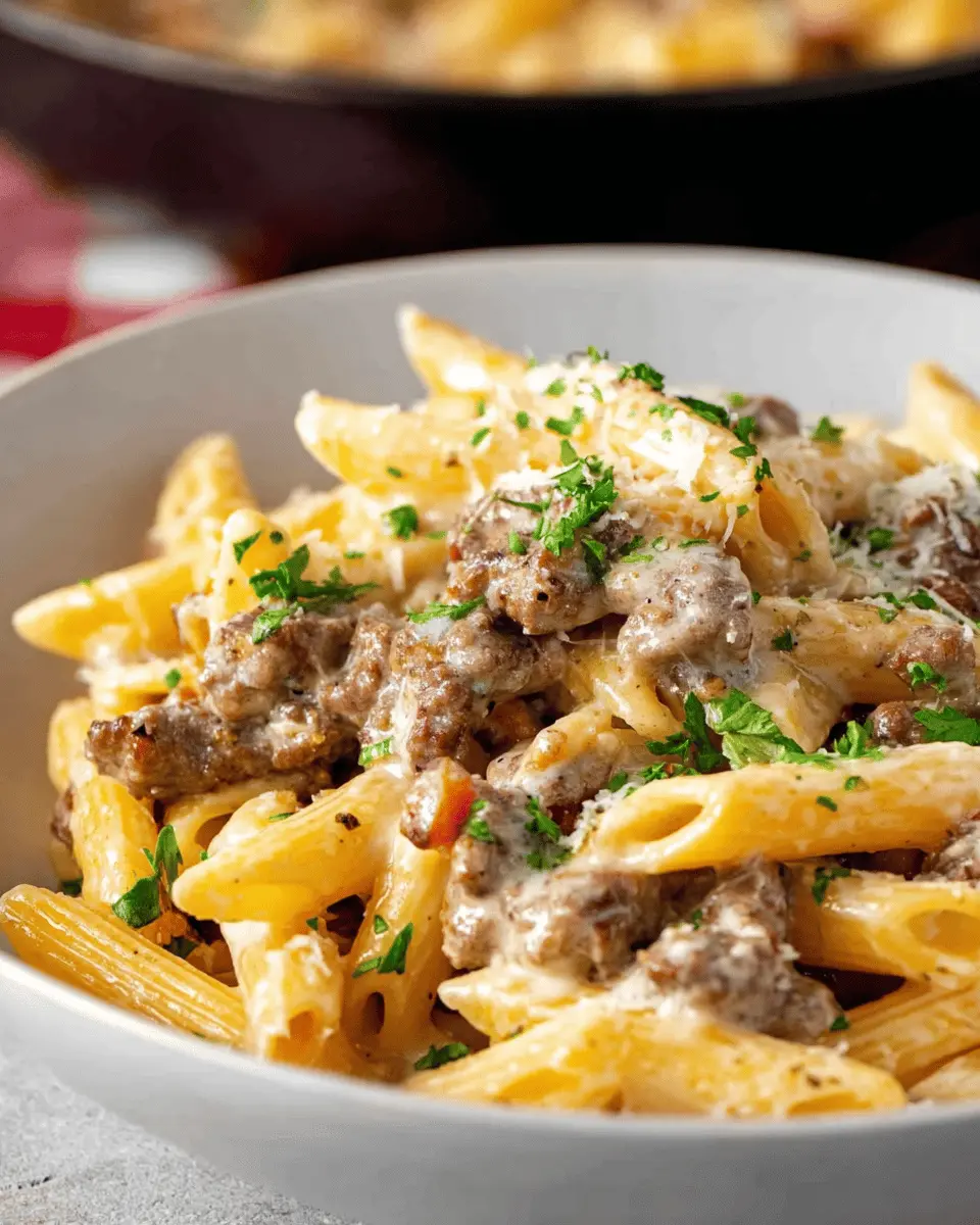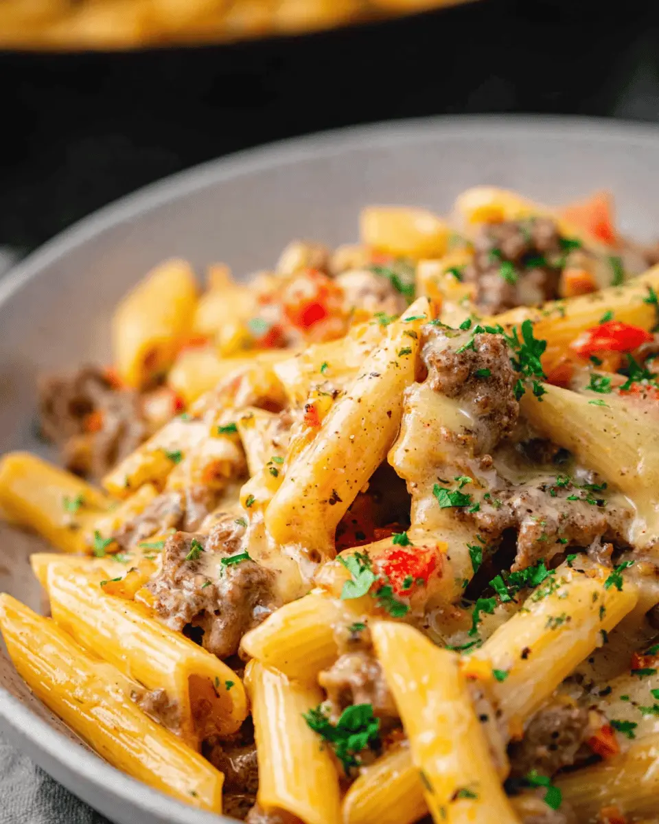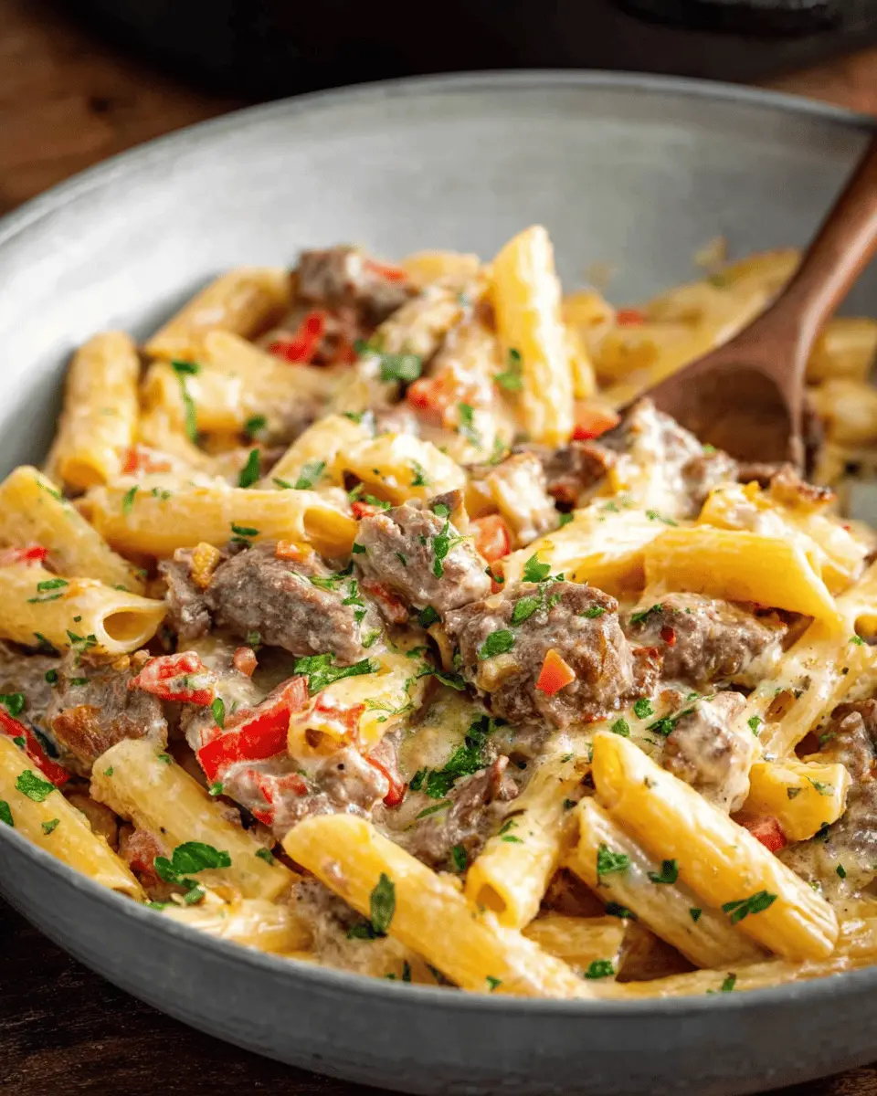 Finally, add the cooked penne and the sautéed steak back into the skillet. Toss everything together until the pasta is well-coated with that luscious creamy sauce. Taste and season with additional salt and pepper if needed. For a finishing touch, garnish with freshly chopped parsley—this adds a pop of color and freshness that’s hard to resist. Serve immediately and watch your friends enjoy every bite of this delightful cheesesteak pasta!