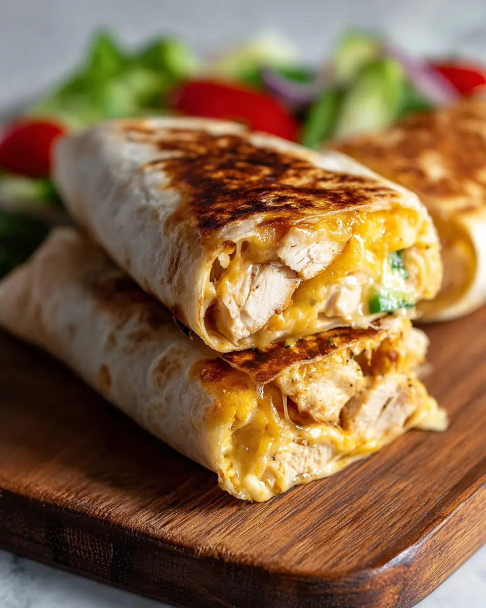 Once your wraps are cooked to perfection, slice them in half for that beautiful presentation. Serve them up immediately while they’re hot and gooey! These cheesy garlic chicken wraps pair wonderfully with a side salad or your favorite dipping sauce, like salsa or guacamole.