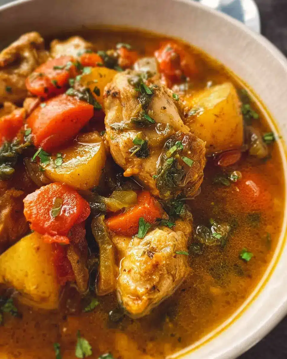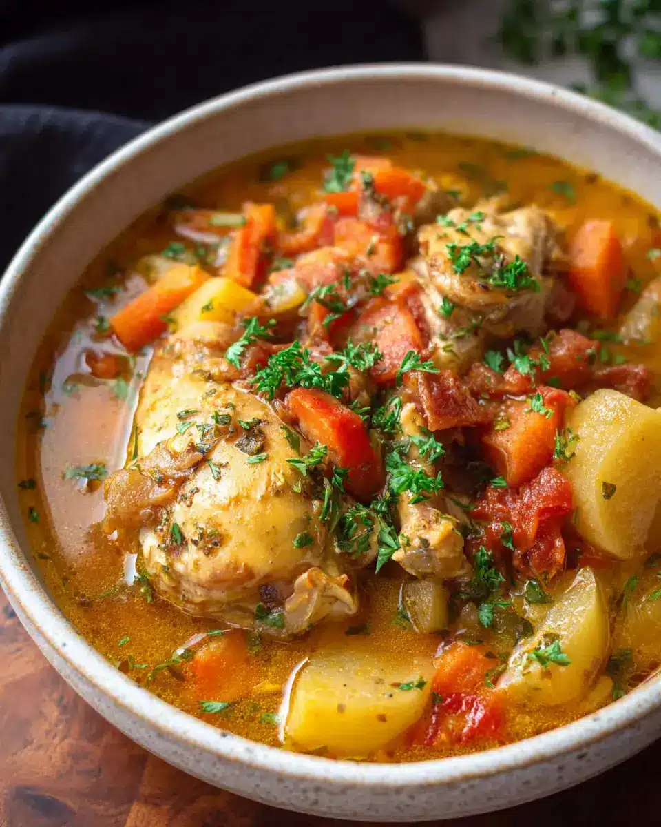 This stew is not only comforting but also packed with nutrients. Rich in protein from the chicken thighs and filled with vitamins from a variety of vegetables, it supports muscle health and boosts overall wellness. Ingredients like celery and carrots provide dietary fiber, promoting digestive health.