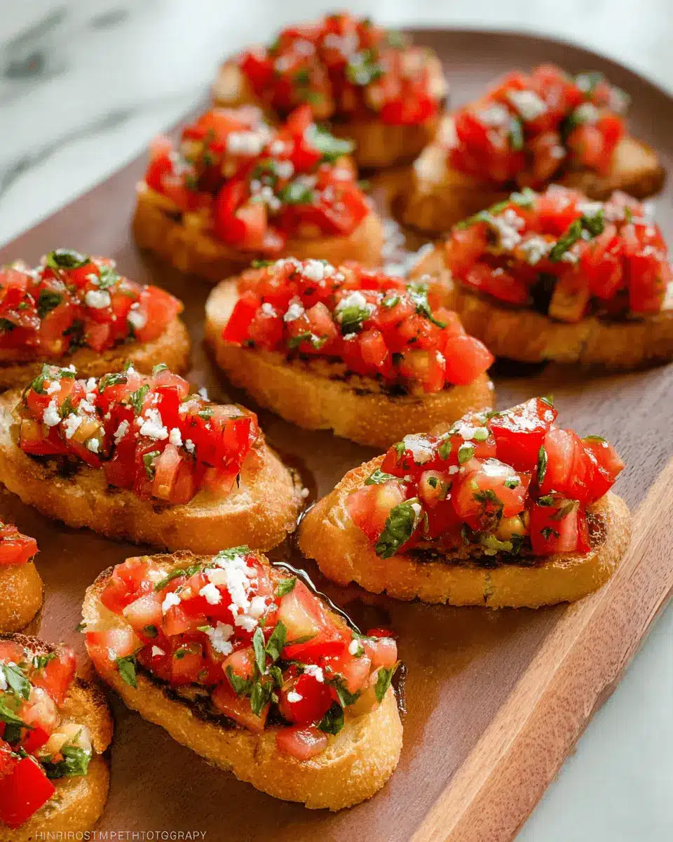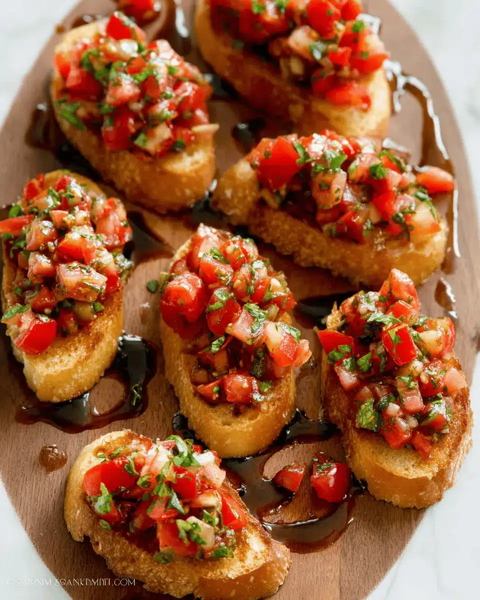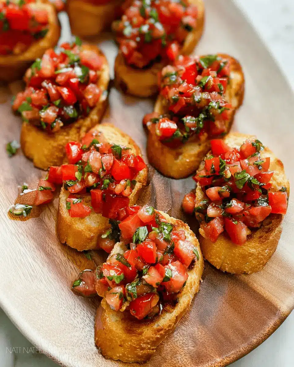 Presentation can elevate your classic bruschetta to the next level. Arrange the toasts on a large wooden board or a white serving platter for contrast, and consider adding small bowls of the tomato mixture and extra toppings like chopped olives or fresh mozzarella. You might also toss in some fresh basil leaves for a pop of color. Drizzle with balsamic glaze right before serving to create a mouth-watering finish. Remember, we eat with our eyes first—so make it shine!