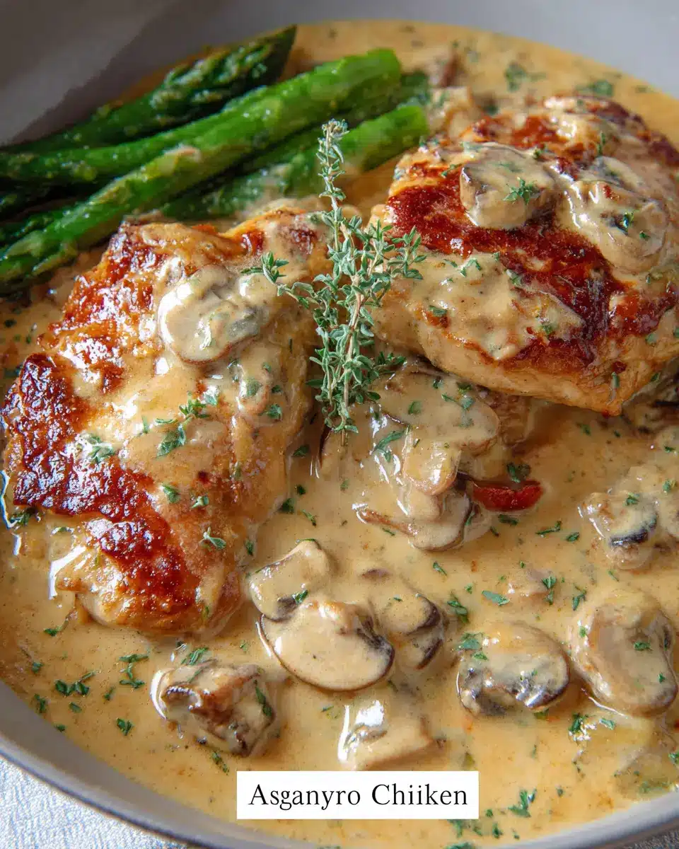 You’ll love the combination of juicy chicken breasts cooked to perfection, sautéed cremini mushrooms, and a velvety asiago cheese sauce that coats every bite. Plus, the recipe calls for ingredients you likely already have on hand, including garlic, thyme, and shallots.
