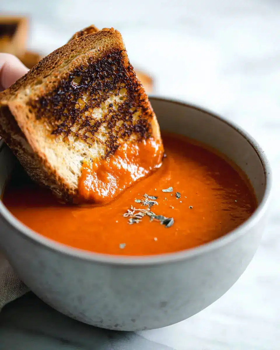 Transform your easy three ingredient tomato soup into a delightful meal with just a few accompaniments. A classic pairing is a crisp, gooey grilled cheese sandwich—the melty cheese complements the soup's acidity perfectly.