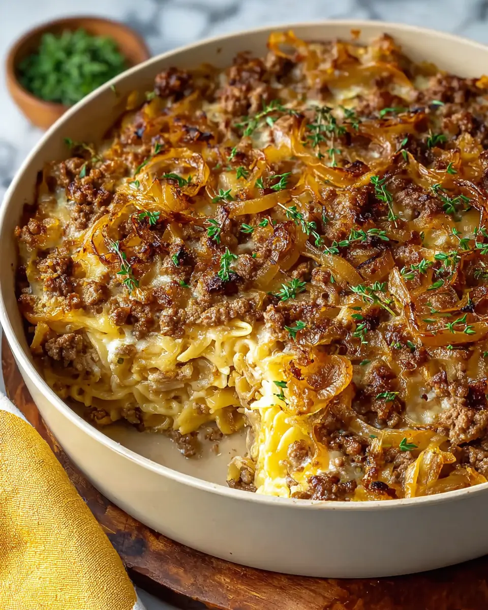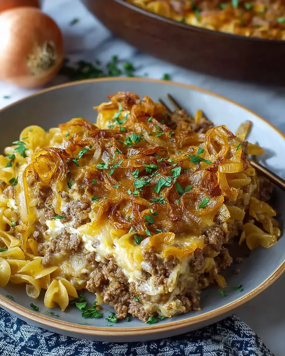 The Family French Onion Hamburger Casserole is a comforting, one-pan dish that combines the rich, savory flavors of caramelized onions and tender ground beef with hearty egg pasta. Reminiscent of the classic French onion soup but with a twist, this casserole is designed for busy families looking to serve a delicious meal without sacrificing time. It’s creamy, filling, and topped with crispy fried onions that not only add flavor but also textural contrast—making every bite a delight.