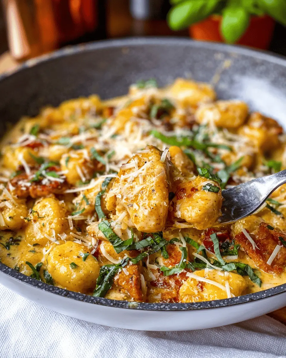 Next, stir in the previously cooked gnocchi and fresh spinach, seasoning with more salt and pepper to taste. This is where everything comes together, turning into a hearty and colorful dish. Add the chicken thighs back to the skillet, letting them simmer for about 2 minutes to heat through. This step ensures every bite is packed with flavors!