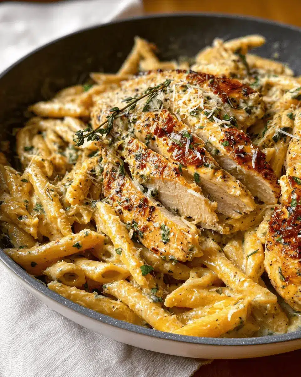 Slice the rested chicken into strips and nestle it back into the pasta, tossing to combine. And just like that, your Garlic Parmesan Chicken and Pasta is ready to be devoured. Serve it hot, and trust me—this dish is bound to become a beloved weekday staple!