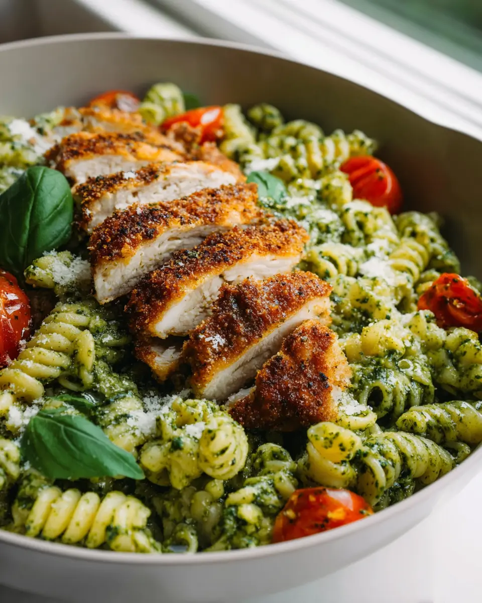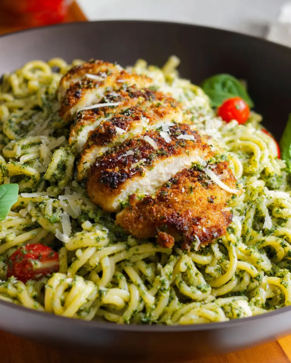 Introduction to Pesto Pasta with Crispy Parmesan Chicken