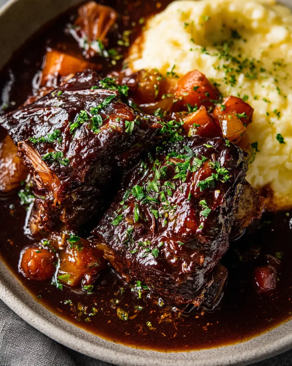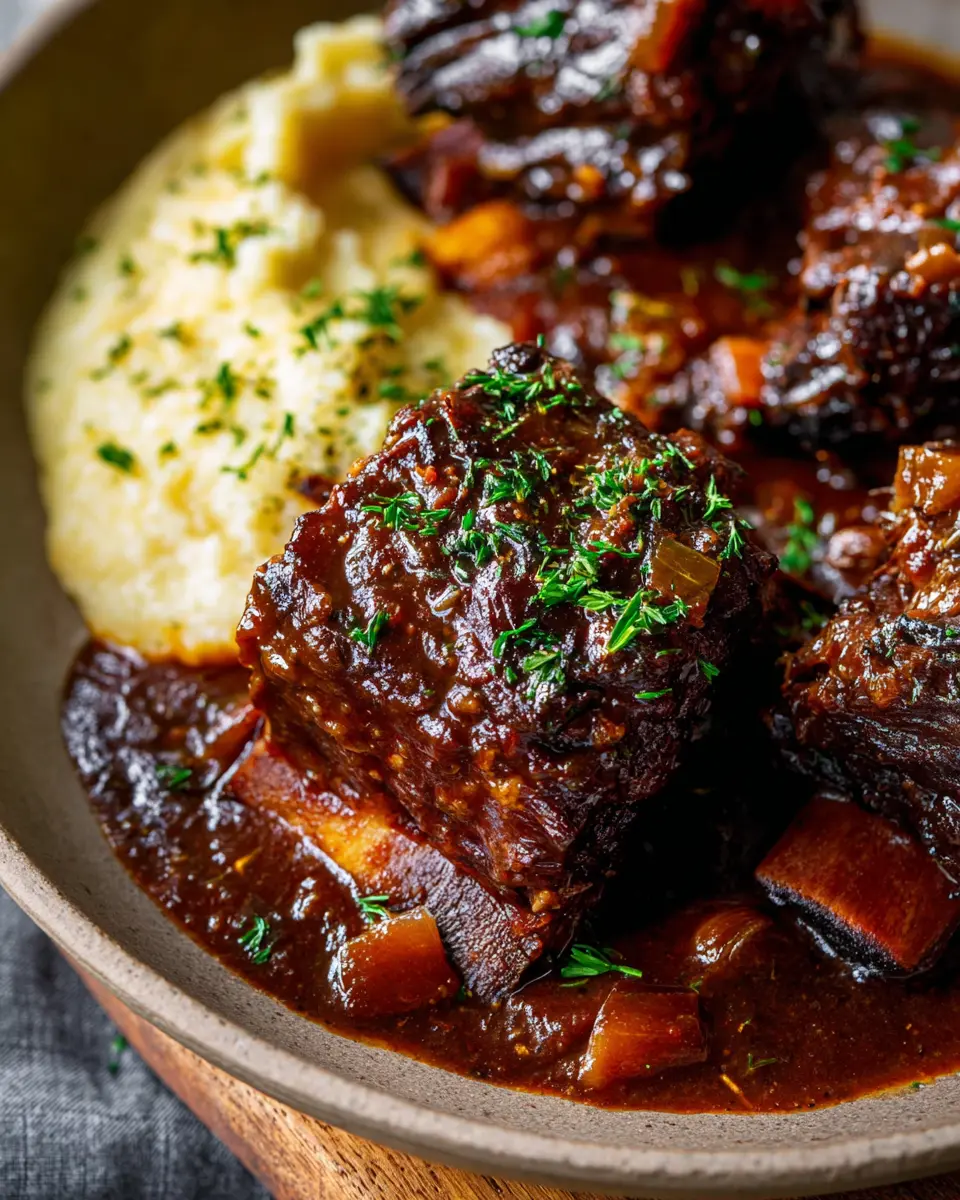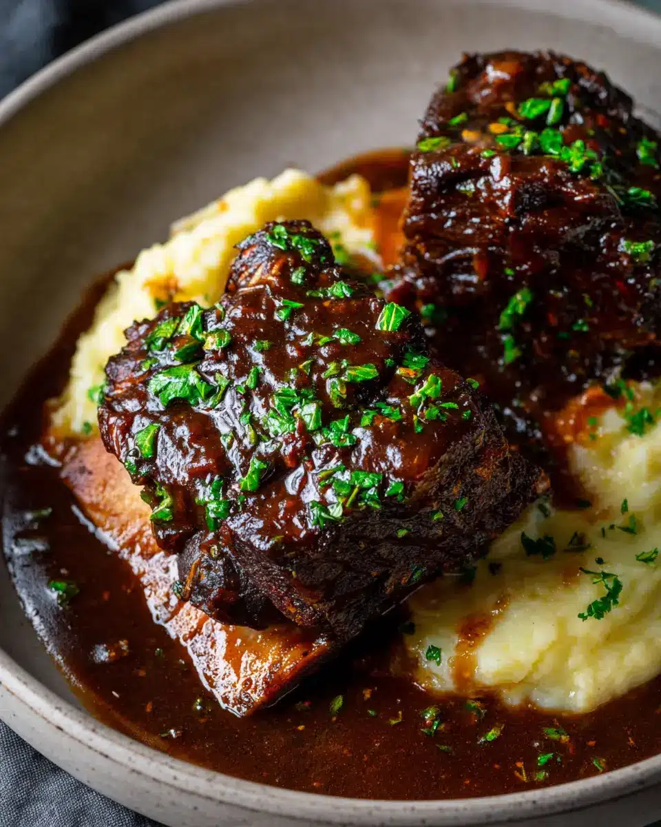 When serving, try arranging the short ribs atop a mound of mashed potatoes, then drizzle the braising liquid over the top. Garnish with fresh herbs for a lovely touch. Alternatively, you could serve the ribs in a shallow bowl with a generous spoonful of their sauce and a sprinkle of chopped parsley—a simple yet elegant presentation that’s bound to impress your guests!