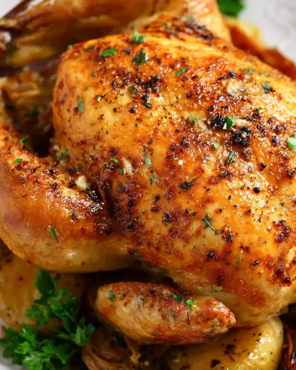 Brush the outside of the chicken with melted butter mixed with pressed garlic. Generously sprinkle salt and pepper all over your chicken. Place it breast-side up in the prepared roasting pan and pop it into your preheated oven. Roasting time typically ranges from 1 hour and 20 minutes to 1 hour and 30 minutes. To ensure it’s properly cooked, use a meat thermometer—the thickest part of the breast should reach 165°F (74°C).