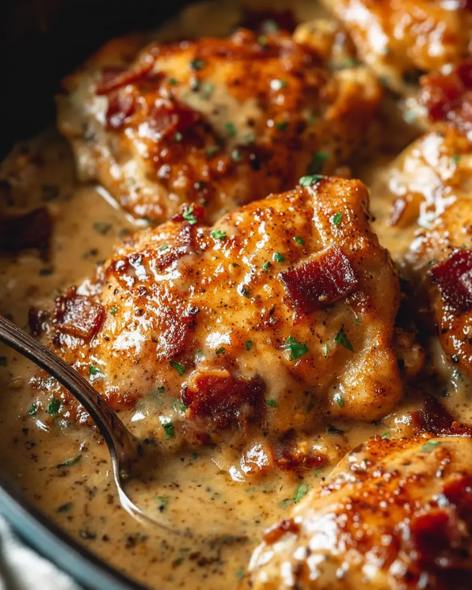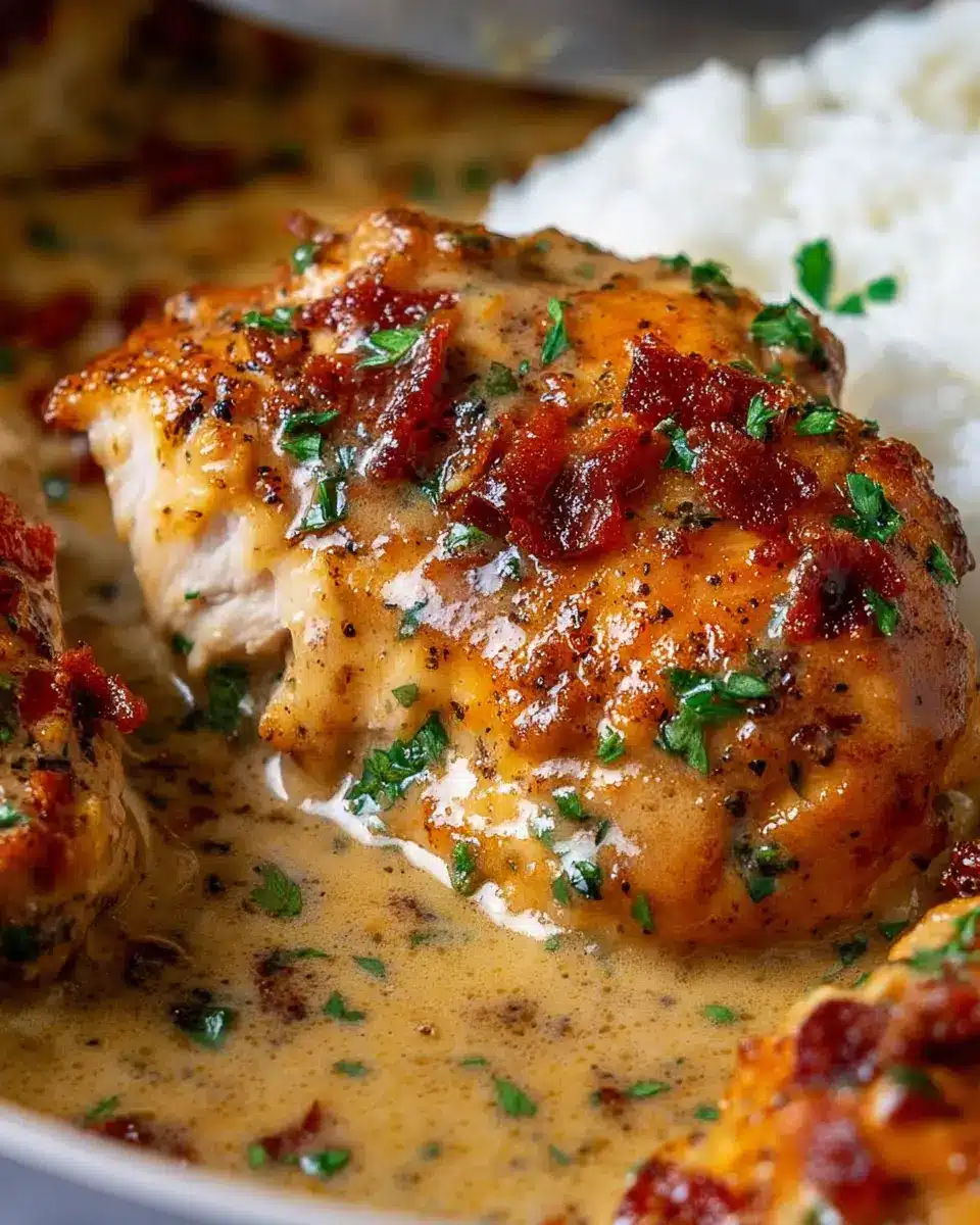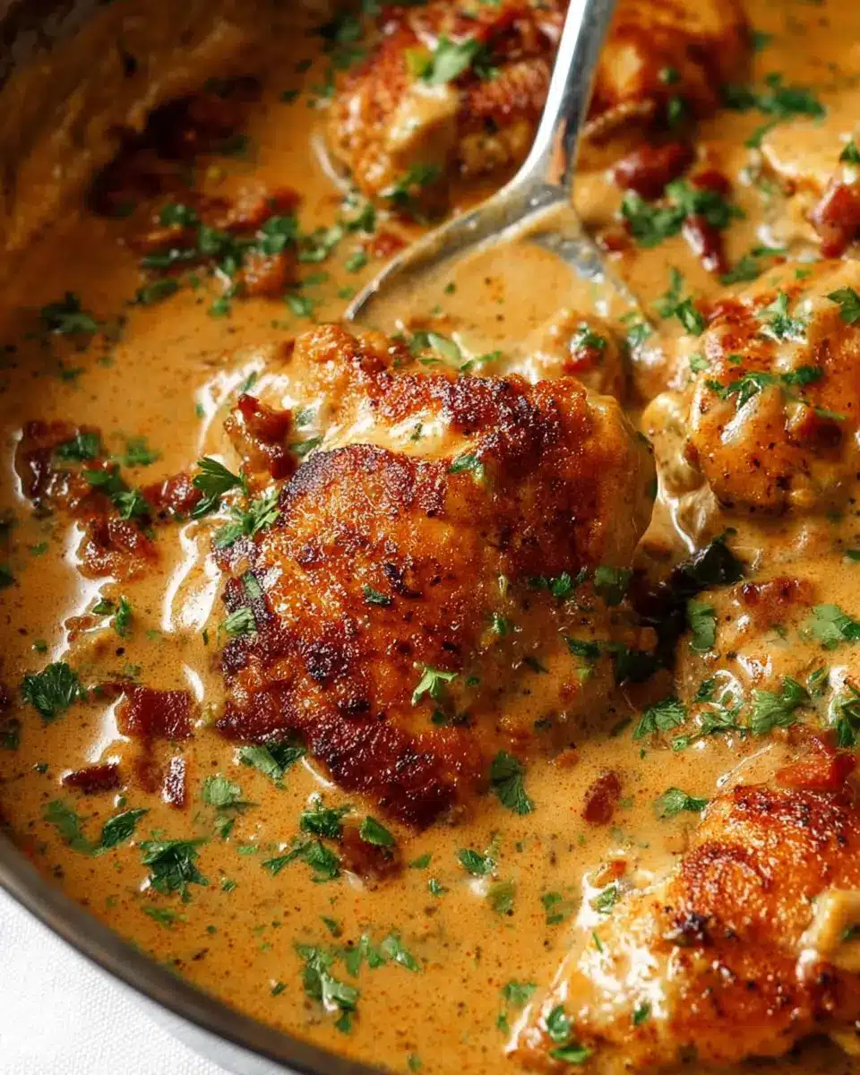 Finally, let’s bring it all together! Add the crispy turkey bacon back into the pan along with the chicken, spooning the rich gravy over it generously. Partially cover and simmer over low heat for about 10-15 minutes, ensuring the internal temperature of the chicken reaches 165°F. Trust me, this step is essential for tender, juicy chicken!