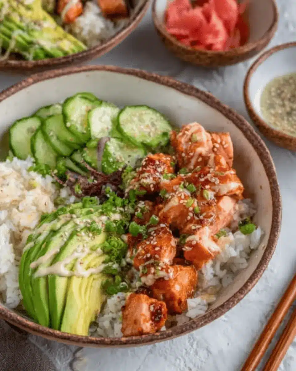 Don’t eat fish? No problem! You can easily create a vegan version of Spicy Salmon Bowls. Replace salmon with marinated and roasted tofu or tempeh for a savory alternative. Use the same marinade ingredients to infuse your plant-based protein with flavor. The coconut rice, pickled cucumbers, and spicy mayo can remain, ensuring you still indulge in that delightful bowl experience. Check out more vegan substitutions here.