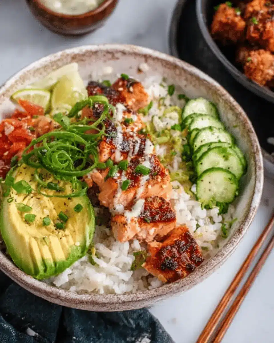 Get ready for a flavor explosion! The preparation for these Spicy Salmon Bowls takes just 15 minutes. This includes gathering your ingredients, slicing cucumbers, and mixing up that zesty mayo.