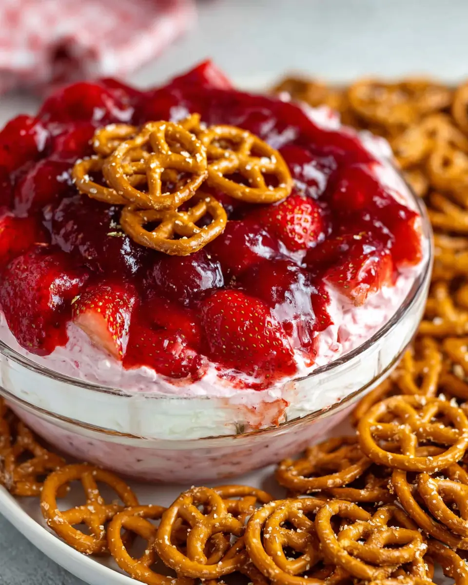 Presentation is key to making your strawberry pretzel salad dip a standout at any gathering. To elevate the look, use a colorful serving bowl to highlight the vibrant red of the strawberry filling. Garnish the top with a sprinkle of crushed pretzels for an added crunch and a pop of color! Consider adding fresh mint leaves or a drizzle of melted chocolate for an extra touch of elegance. For an engaging display, create a dip bar with various dippers arranged artfully around the dip—your guests will love it!