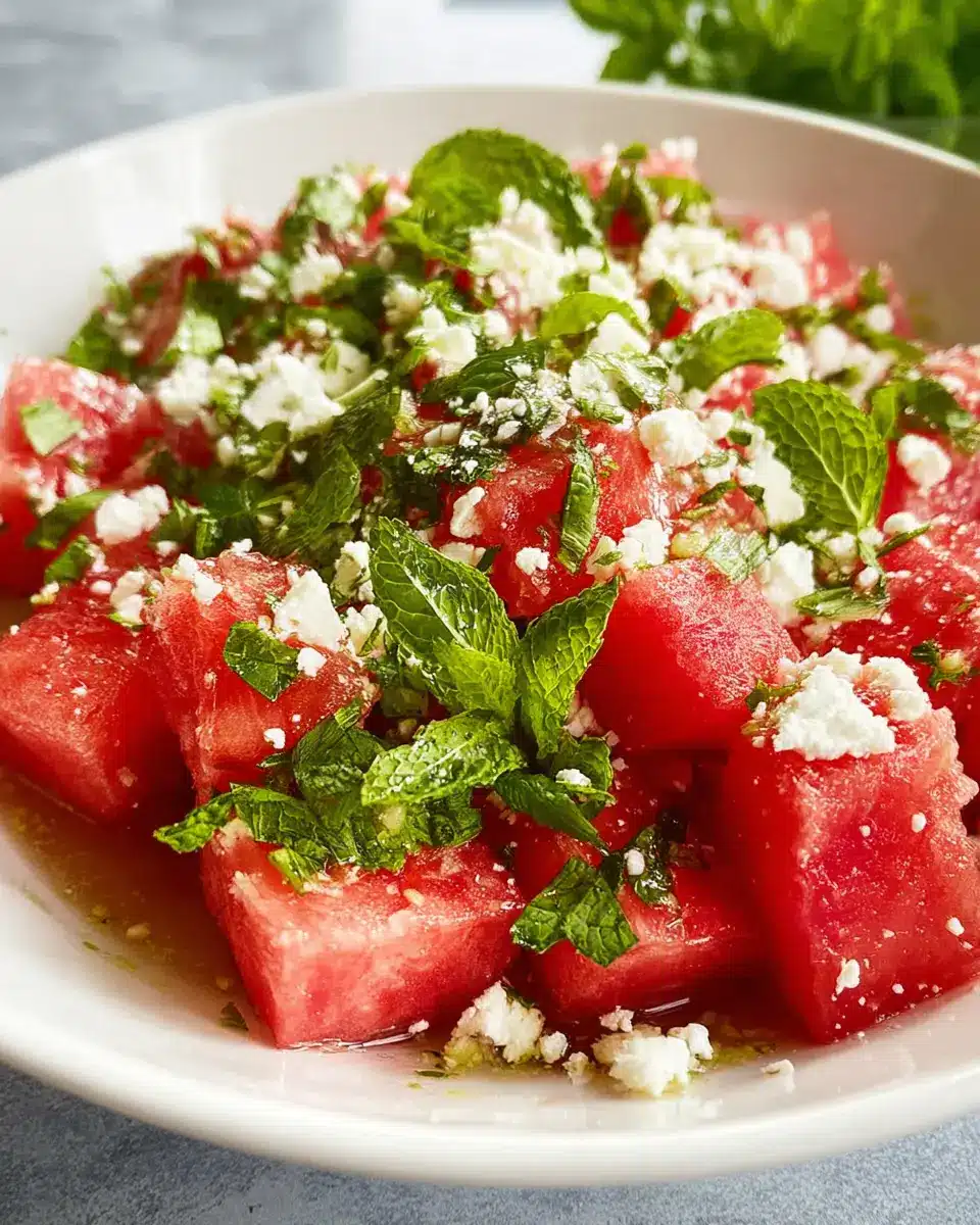 One of the standout features of this salad is its simplicity. With just a handful of fresh ingredients, you can whip up a delicious side dish or light lunch in mere minutes. Plus, watermelon is over 90% water, making it hydrating — perfect for those hot days when staying refreshed is key. Mint, known for its digestive benefits, adds a cooling effect that can rejuvenate you after a long, sun-soaked day.